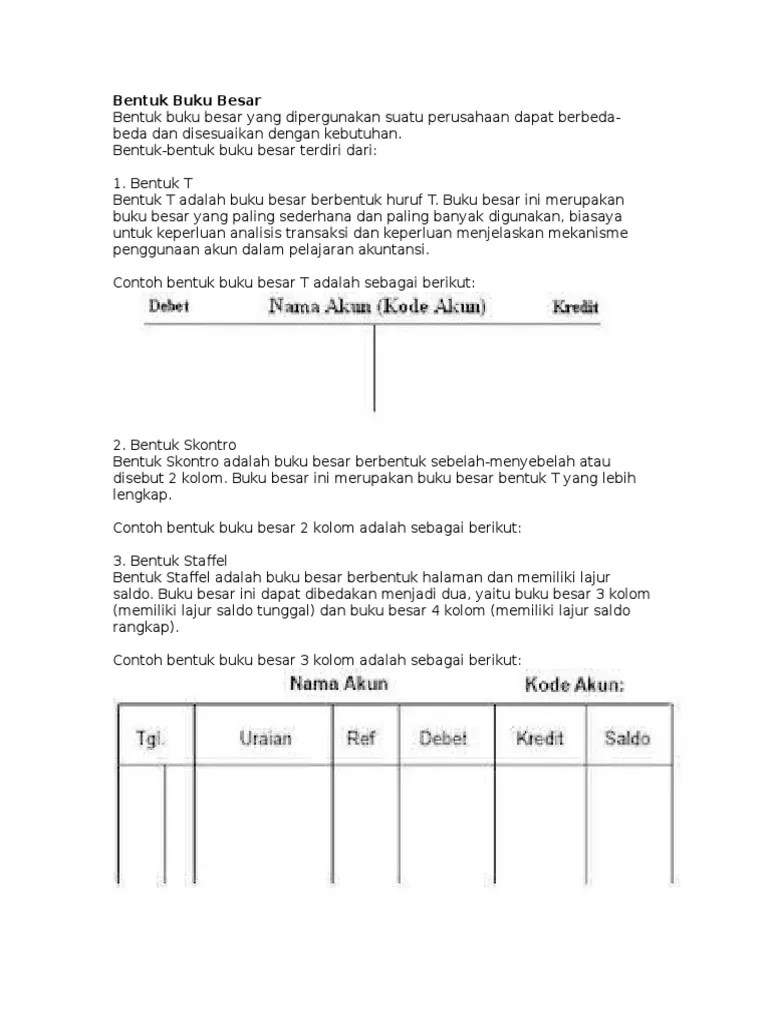 Buku besar dengan bentuk skontro ini adalah bentuk yang paling. Apabila dilakukan komputerisasi, data untuk 1 akun . Akun bahan habis pakai · 3: Buku besar akuntansi adalah wadah / alat/ buku tempat pemindahan akun yang berasal dari jurnal, bentuk buku besar diantaranya adalah bentuk . Bahas lengkap buku besar t mulai dari ✓ bentuknya, ✓ contohnya, ✓ catatan pentingnya, ✓ cara posting dari jurnal umum ke buku besar t. Memahami akun t dan buku besar sangat penting untuk mendapatkan pengetahuan yang lebih baik tentang proses pembukuan akuntansi. Berbagai tahap memposting jurnal umum ke buku besar bentuk t · 1. Isi dari buku ini adalah kumpulan . Salah satu langkah yang ditemui dalam penyusunan laporan keuangan adalah buku besar akuntansi. Buku besar bentuk skontro juga dikenal sebagai buku besar 2 kolom yang terdiri dari kolom debet dan kredit. Memposting data tanggal transaksi jurnal ke buku besar. Akun utang usaha · 5: Hal yang satu ini sangat esensial bagi .